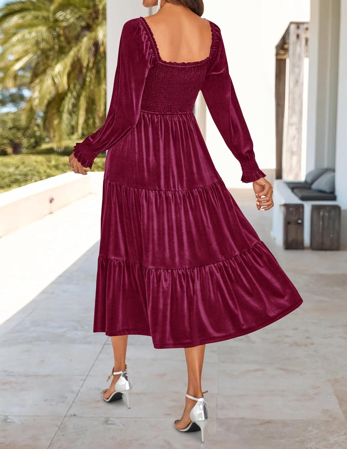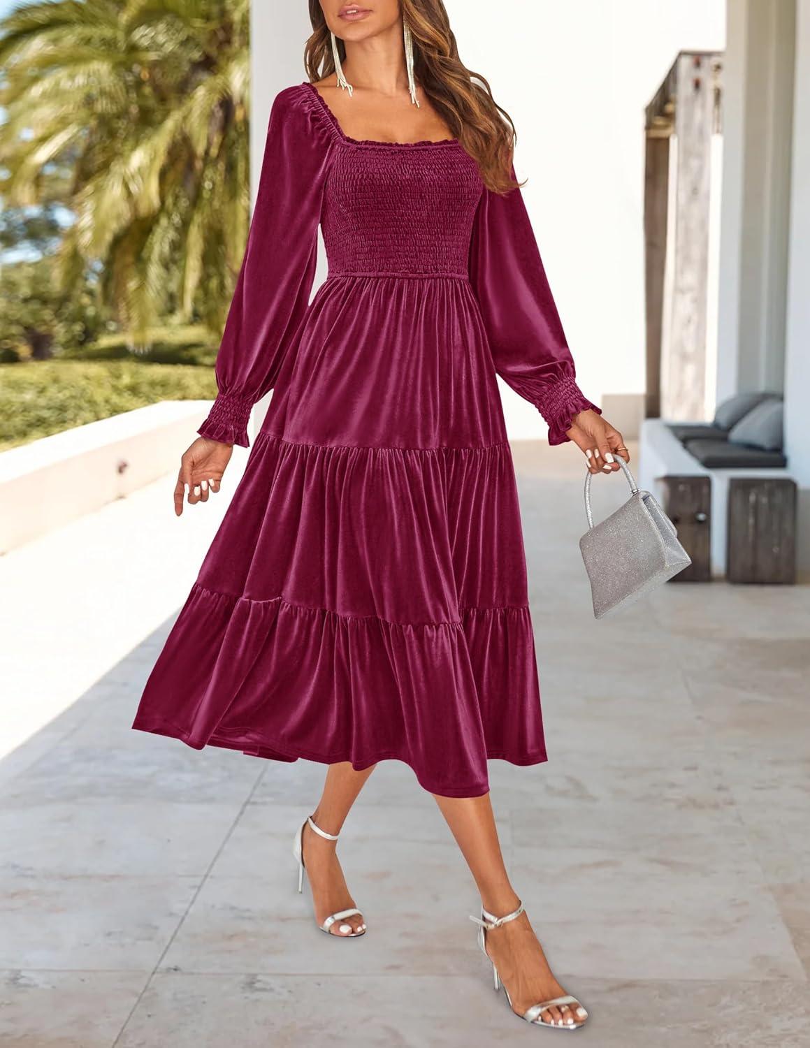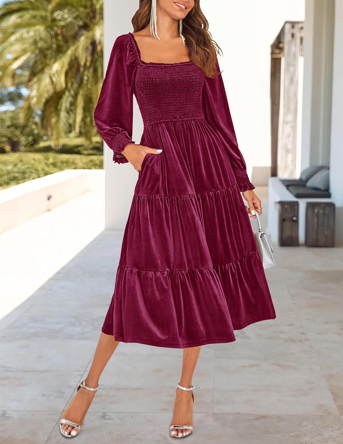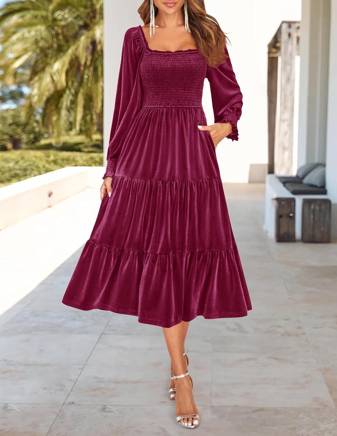 ZESICA Women’s Velvet Long Sleeve Dresses 2025 Fall Square Neck Smocked Ruffle A Line Flowy Midi Dress with Pockets(Burgundy)
