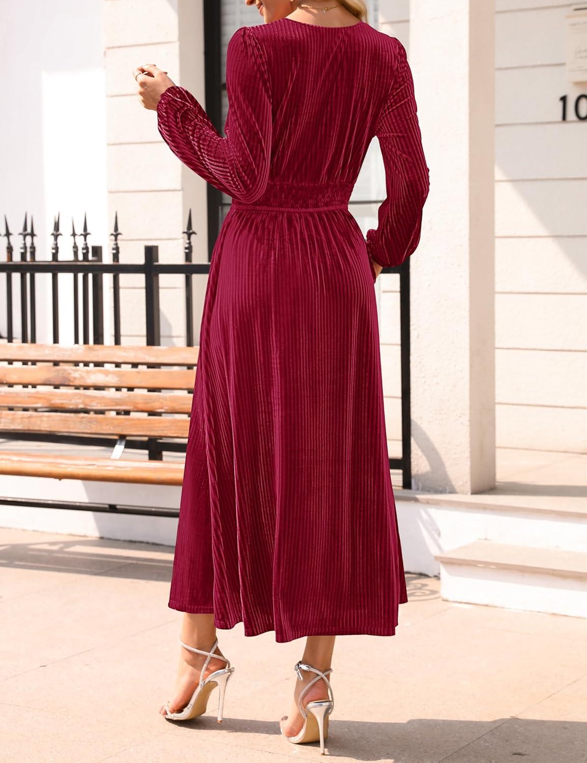 ZESICA Women’s Velvet Midi Dress 2025 Casual V Neck Long Sleeve Solid Color Elastic High Waist Flowy Evening Party Dresses(Wine Red)